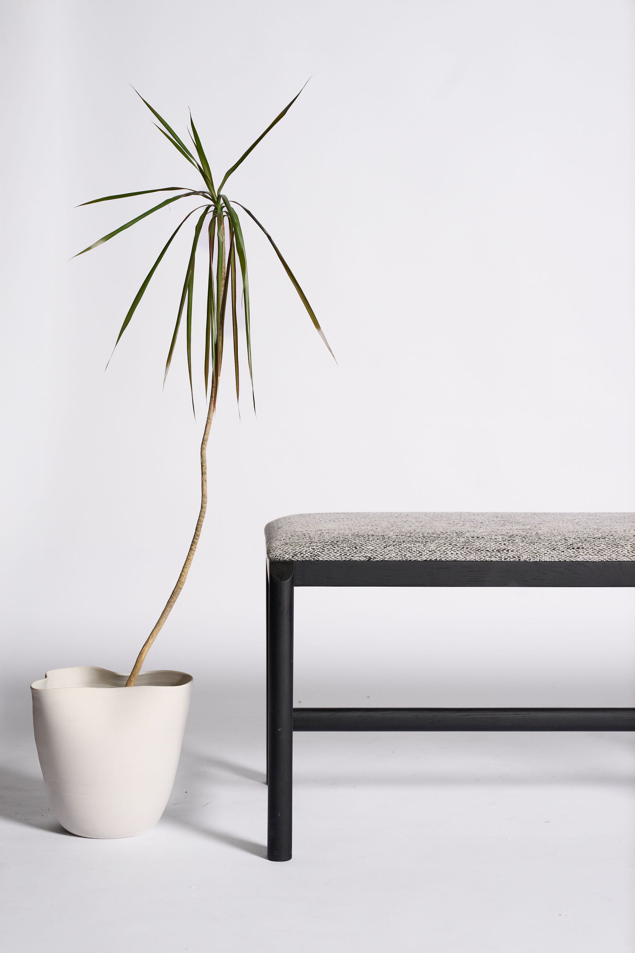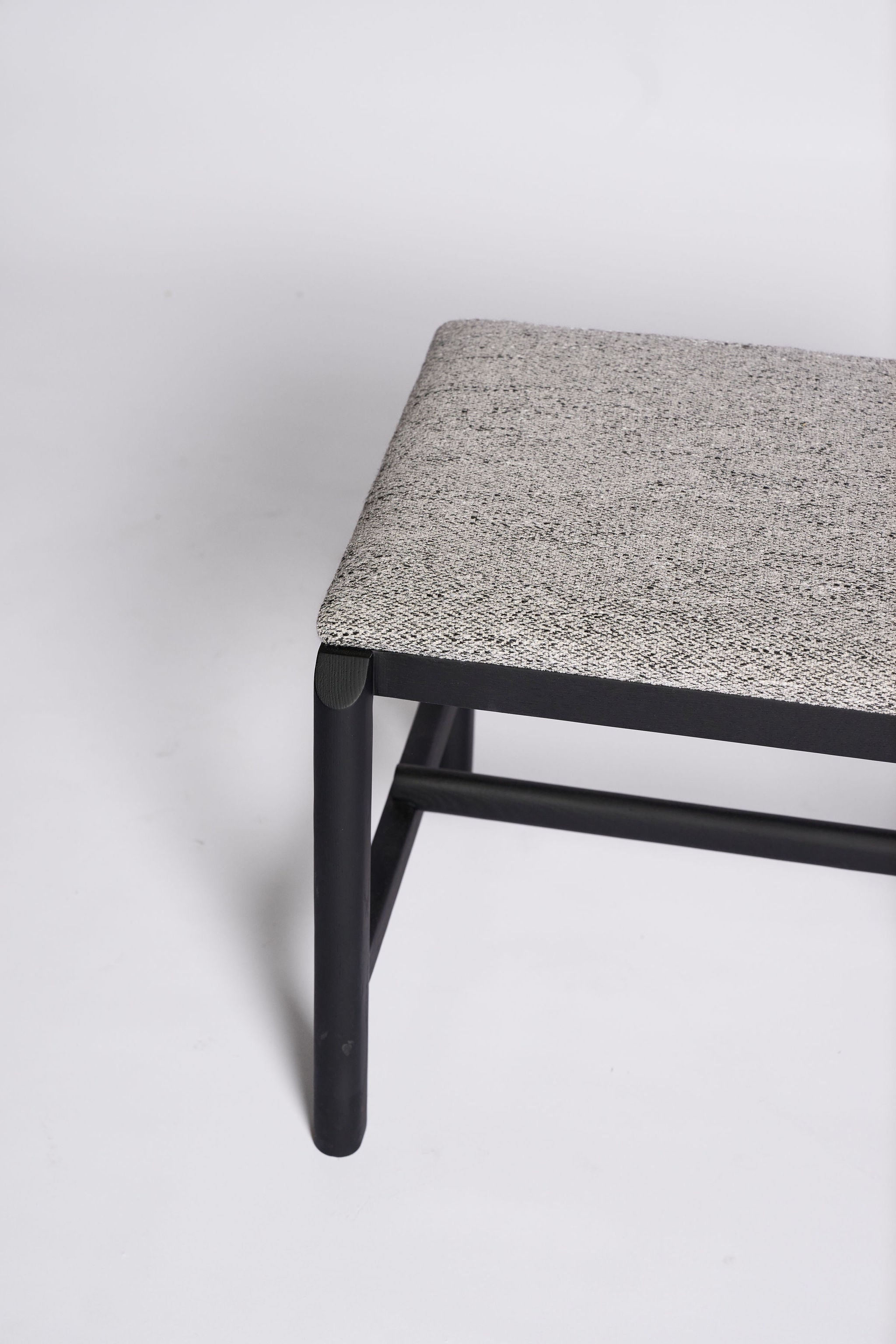 Alister is designed for the everyday pause. A slender timber frame with rounded posts supports a comfortably cushioned top, giving a light profile with solid presence. The tactile upholstery brings gentle texture, pairing easily with linen, stone and wood.