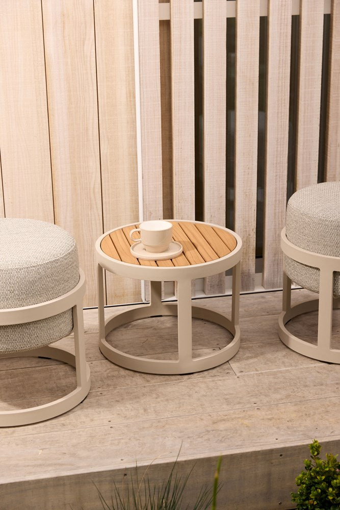 Mocha powder coated aluminium frame with FSC certified Teak, sustainably sourced and highly durable.