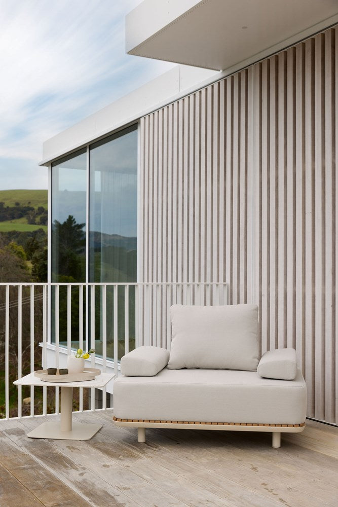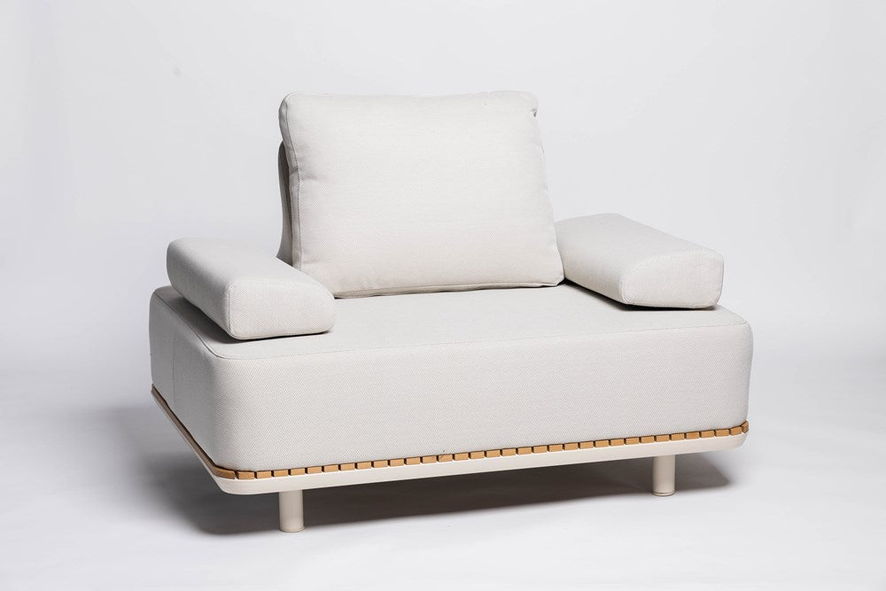 The Dawn Sofa brings elegance and sleek minimalism to the forefront effortlessly. Built on an aluminium frame for long-lasting outdoor use it has moveable cushion supports and an integrated teak side table for convenience and class.