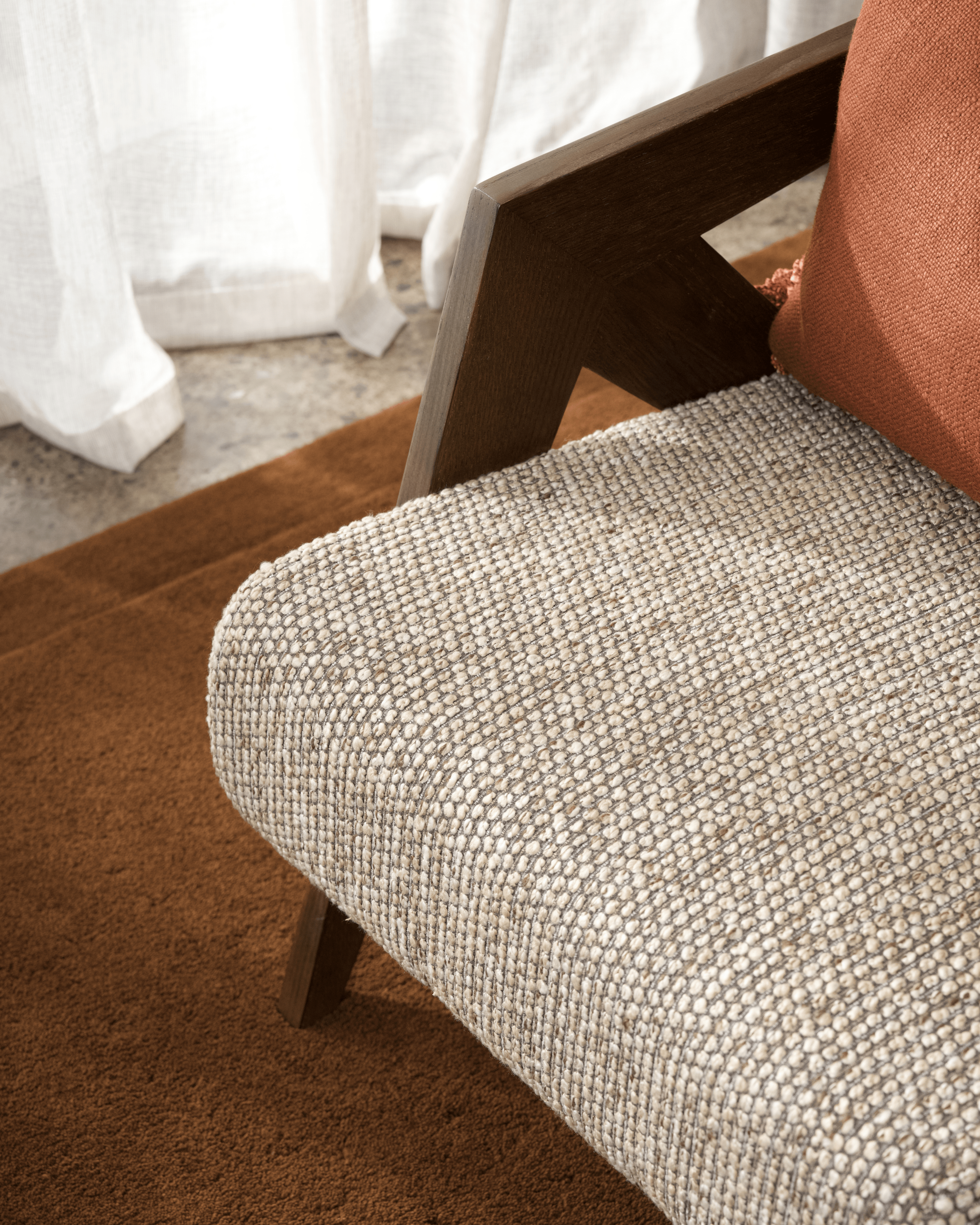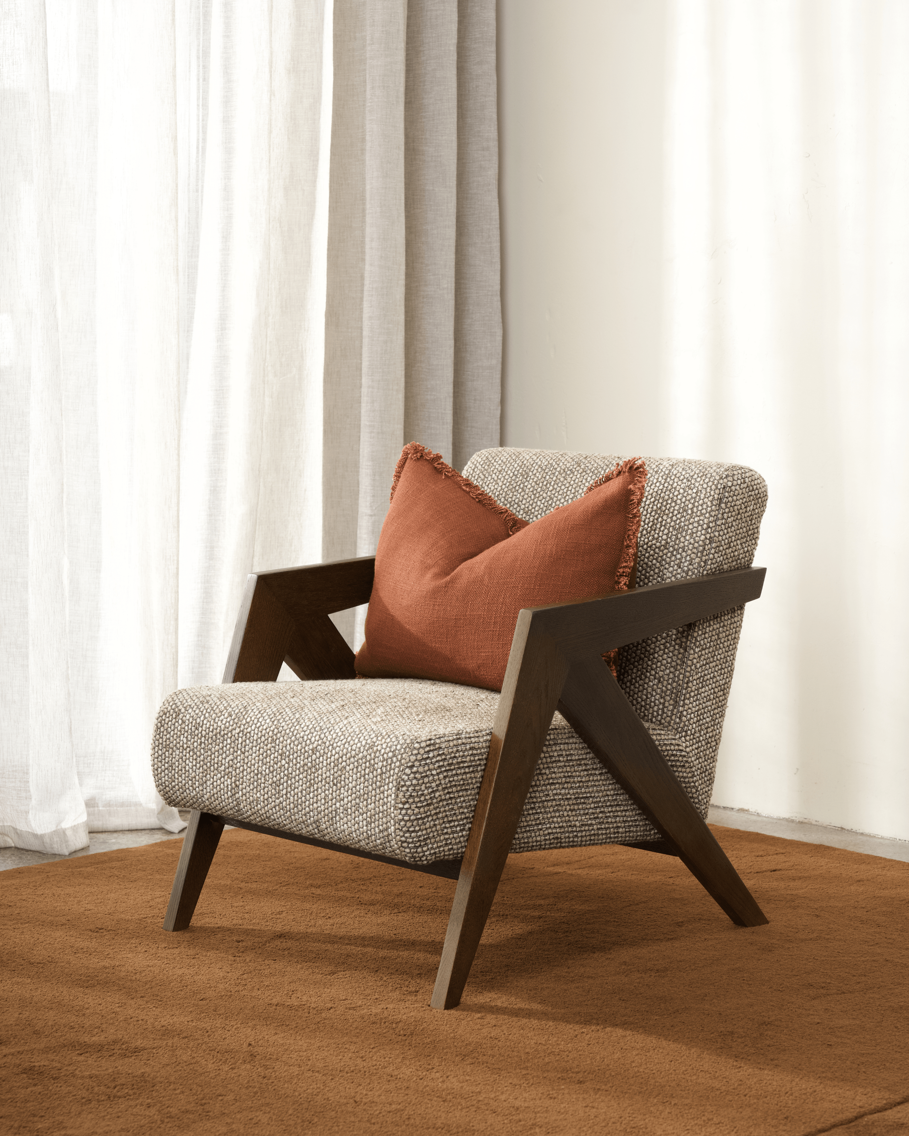 Elevate your space with the Dos Chair, a modern, yet classical toned masterpiece blending form and function. Upholstered in luxurious fabric with a subtle earthy hues, this chair brings texture and style to any interior. Its playful yet sophisticated design is complemented by sharp, solid arms and legs that add that touch of charm.