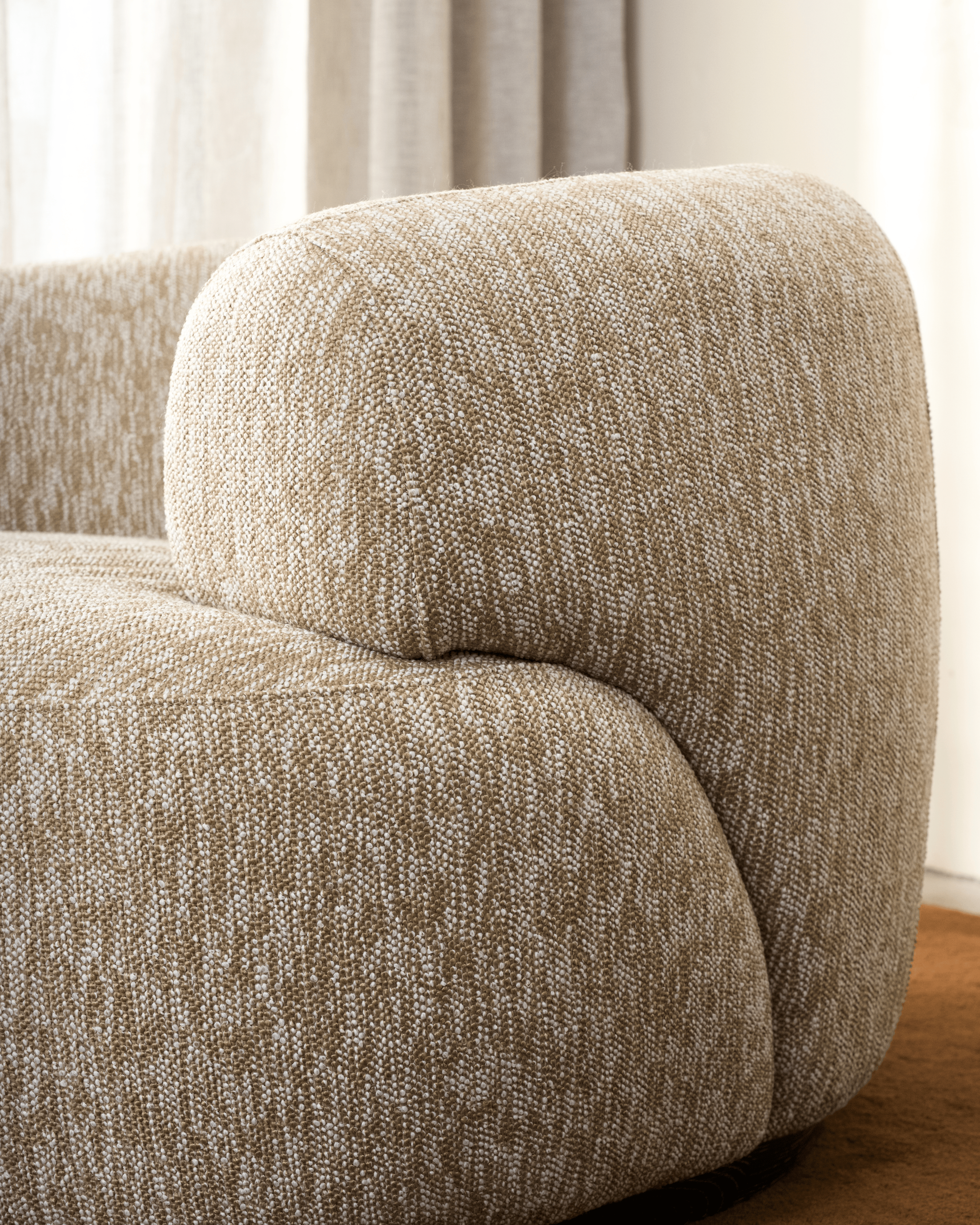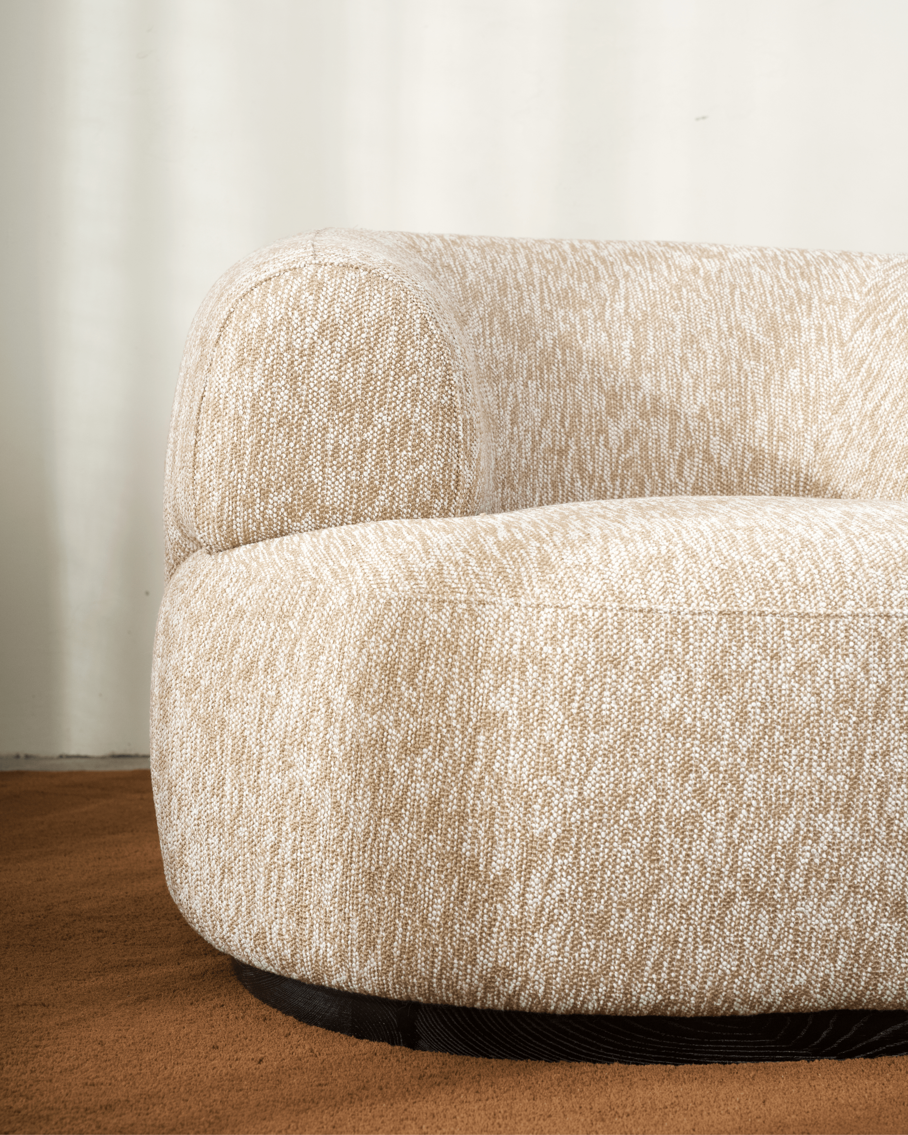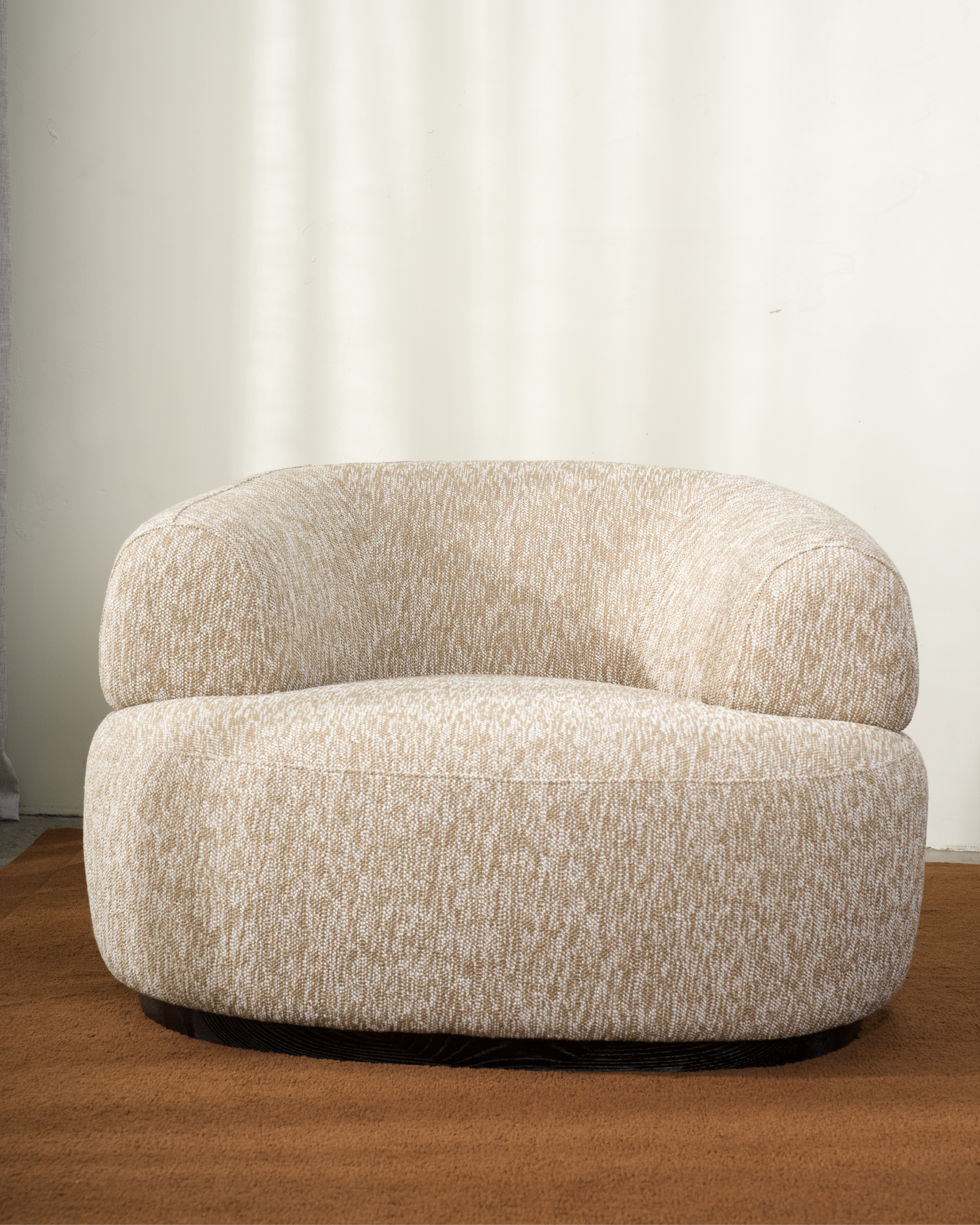 The Drift Chair is designed for spaces that flow. Its sweeping, sculptural form creates a soft sense of movement, while the low back and generous cushioning offer laid-back comfort with refined appeal. Upholstered in a textured, natural-toned fabric and grounded by a dark timber base, Drift is equal parts statement and sanctuary—perfect for open-plan living or creating calm in the corner of a room.