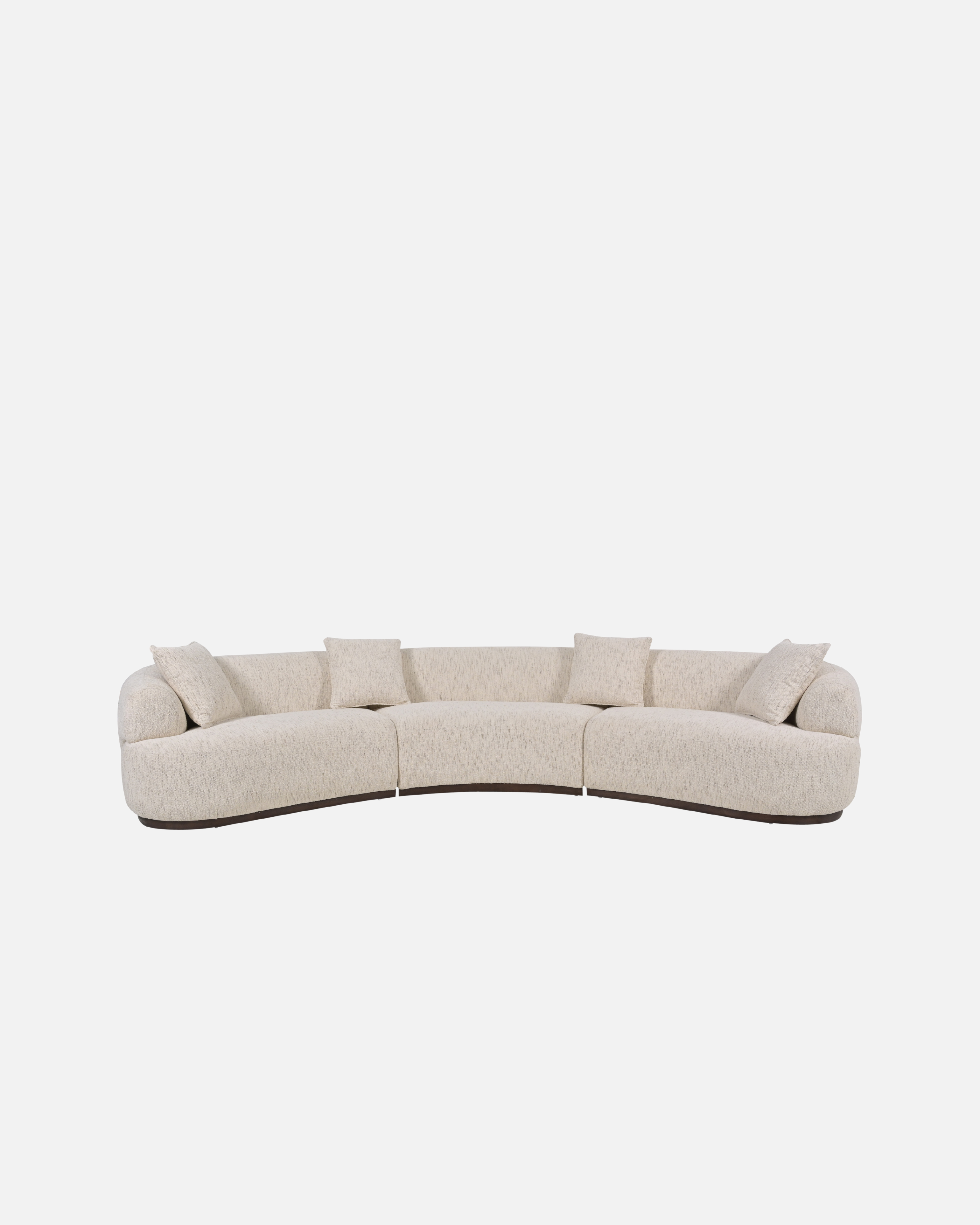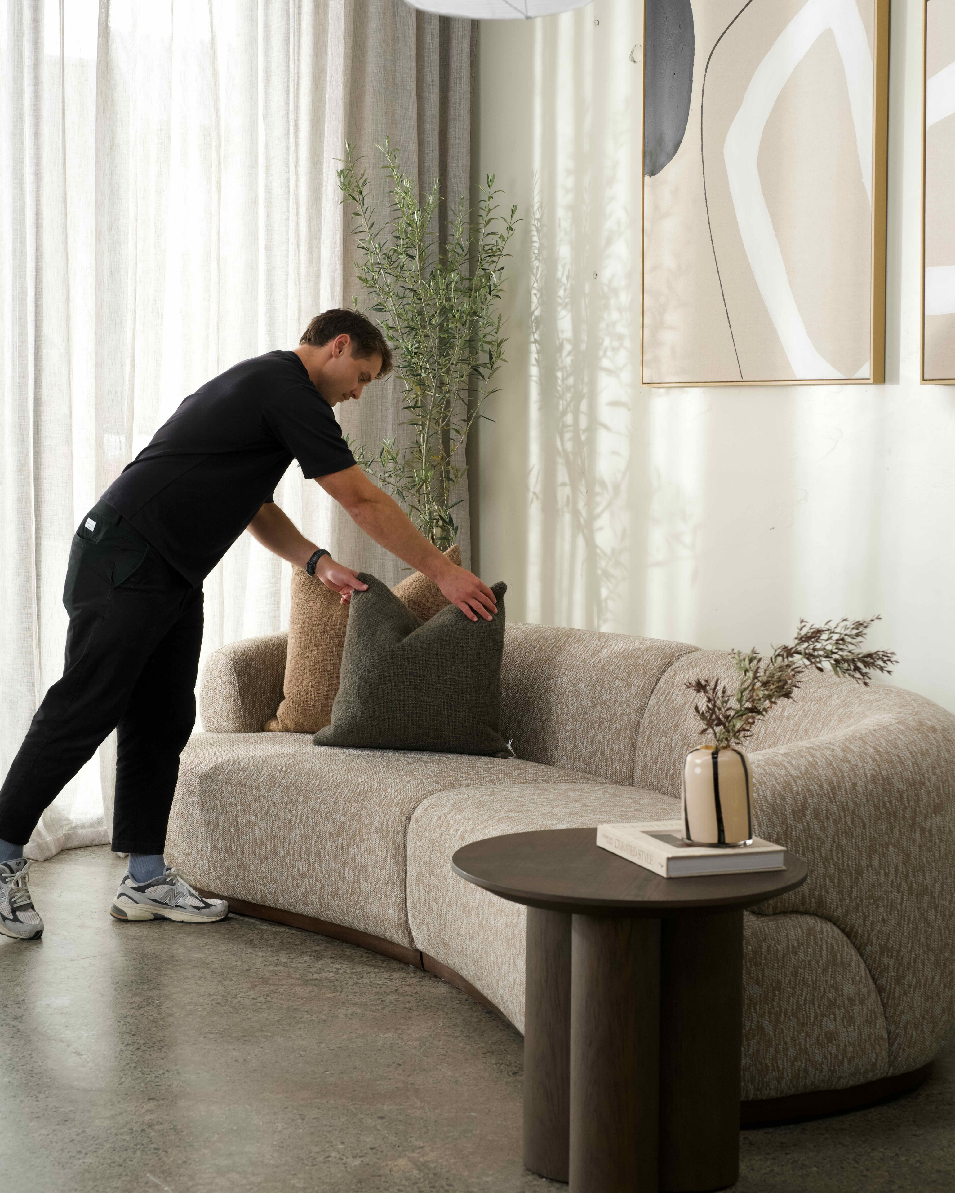 Upholstered in textured, natural-toned fabric and grounded by a dark timber base, Drift is equal parts statement and sanctuary—perfect for open-plan living or creating calm in the corner of a room.