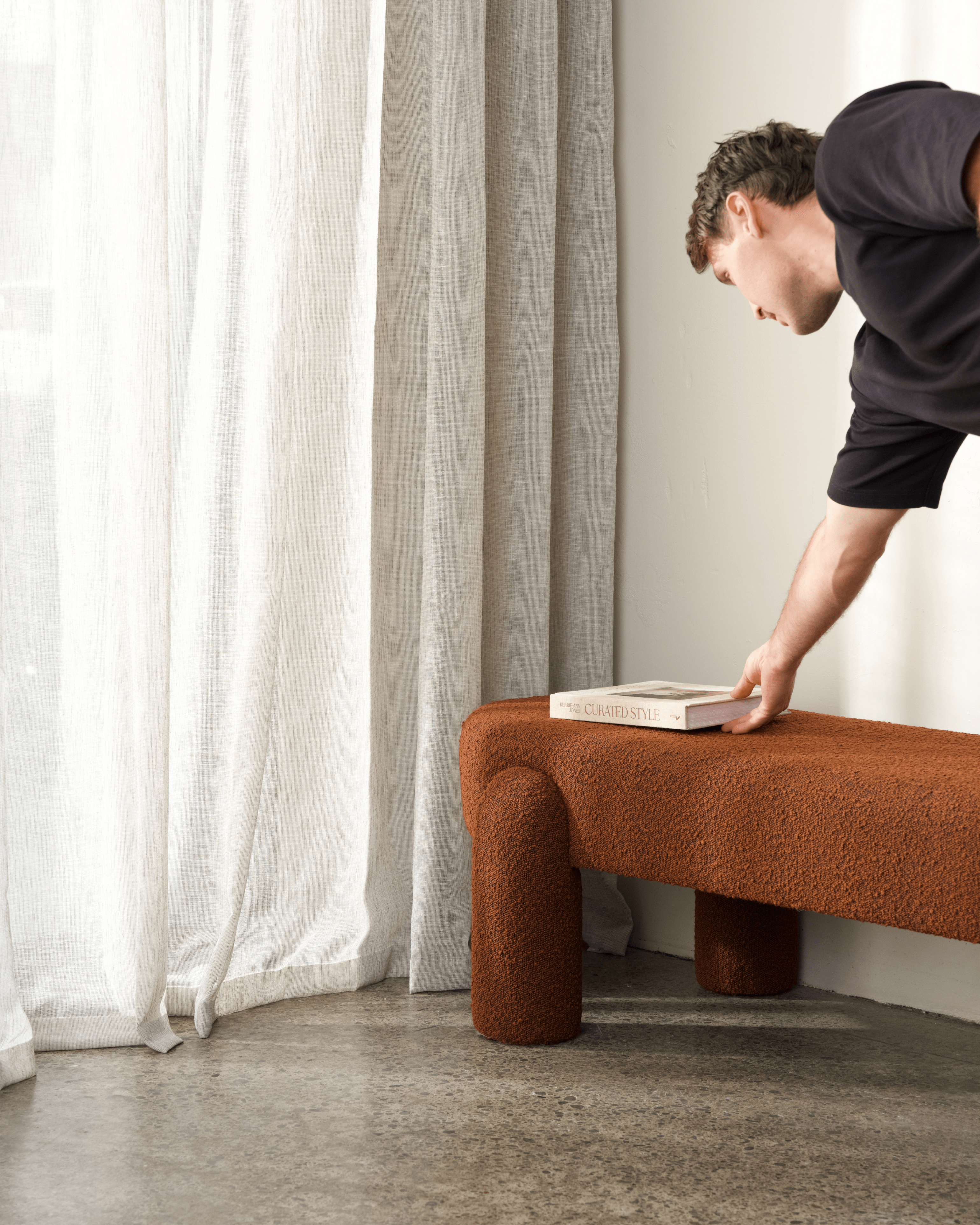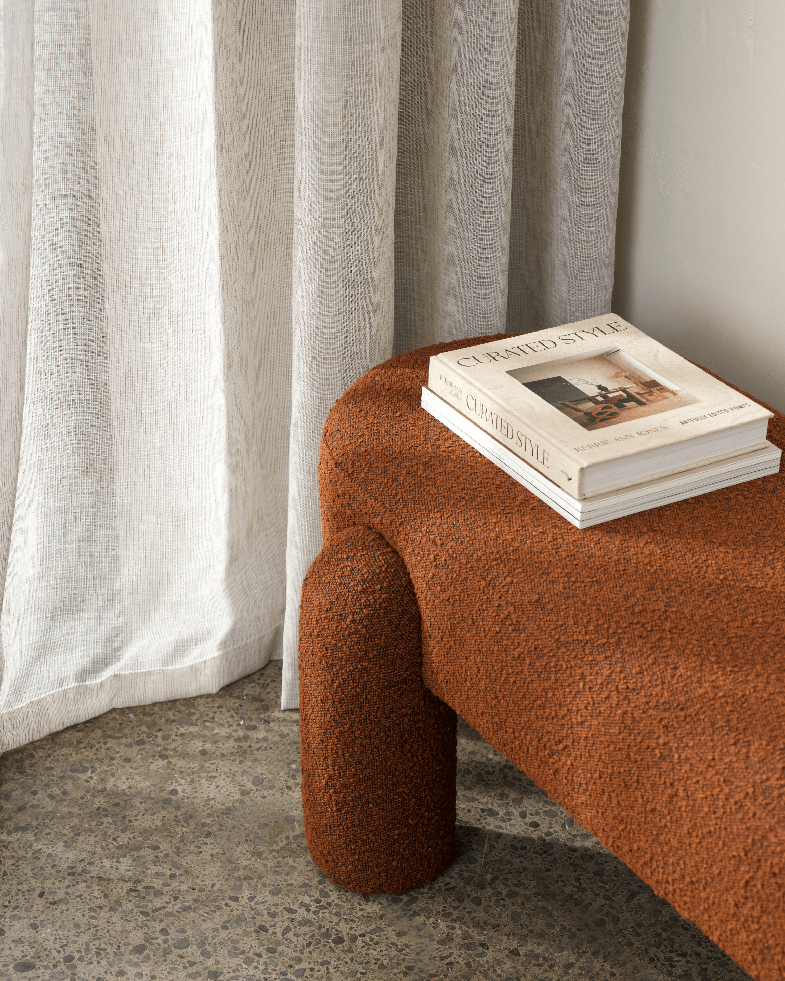 Upholstered in luxurious Burnt Rust fabric with a rich, earthy hue, this bench brings texture and style to any interior. Its playful yet sophisticated design is complemented by rounded, solid legs that add stability and charm. Perfect as an accent piece for a bedroom, hallway, or living area, the Dundee Bench is both versatile and striking, offering a comfortable seat and a statement of contemporary design. Its minimalist yet inviting aesthetic ensures it harmonizes with various decor styles, from mid-century modern to eclectic.