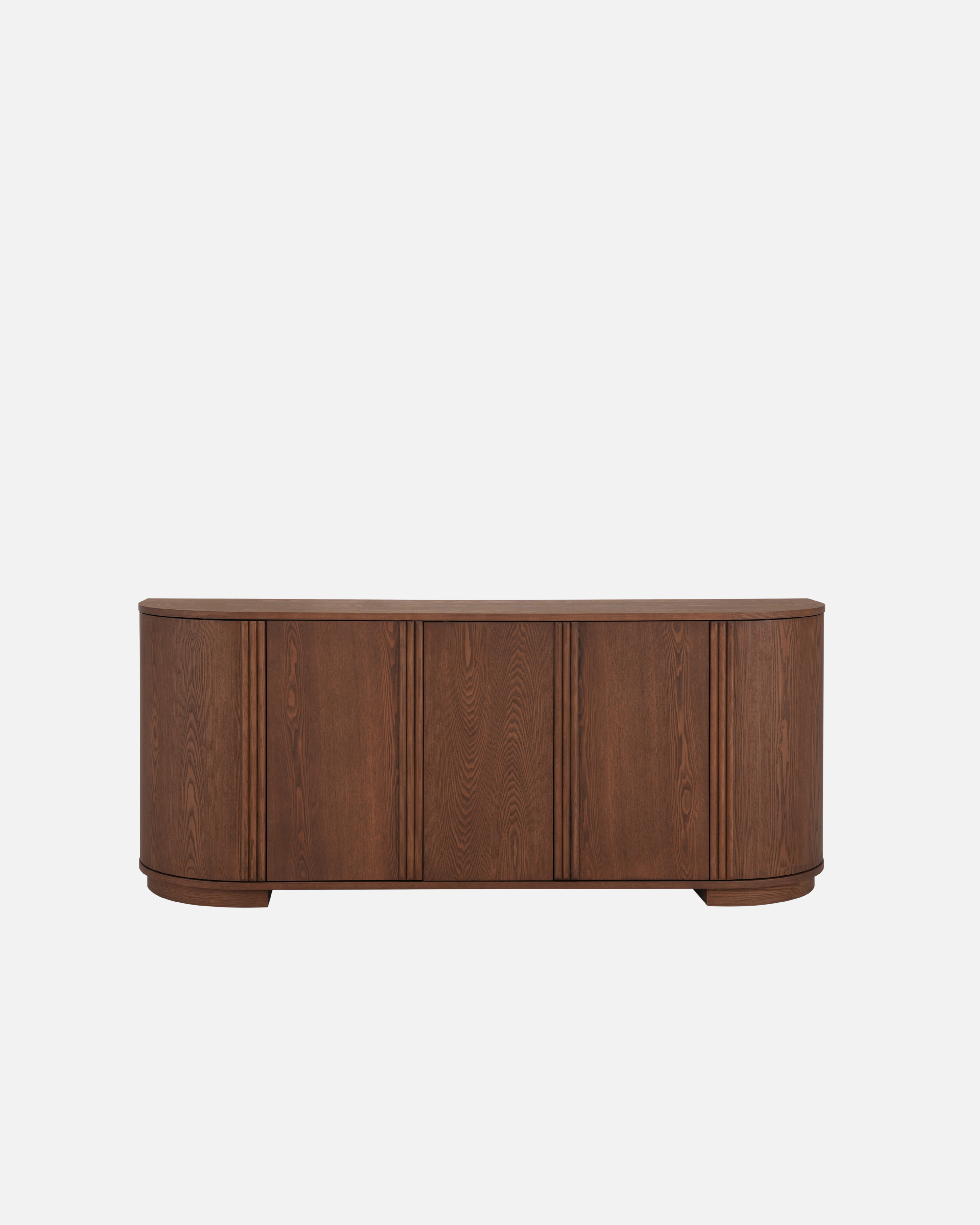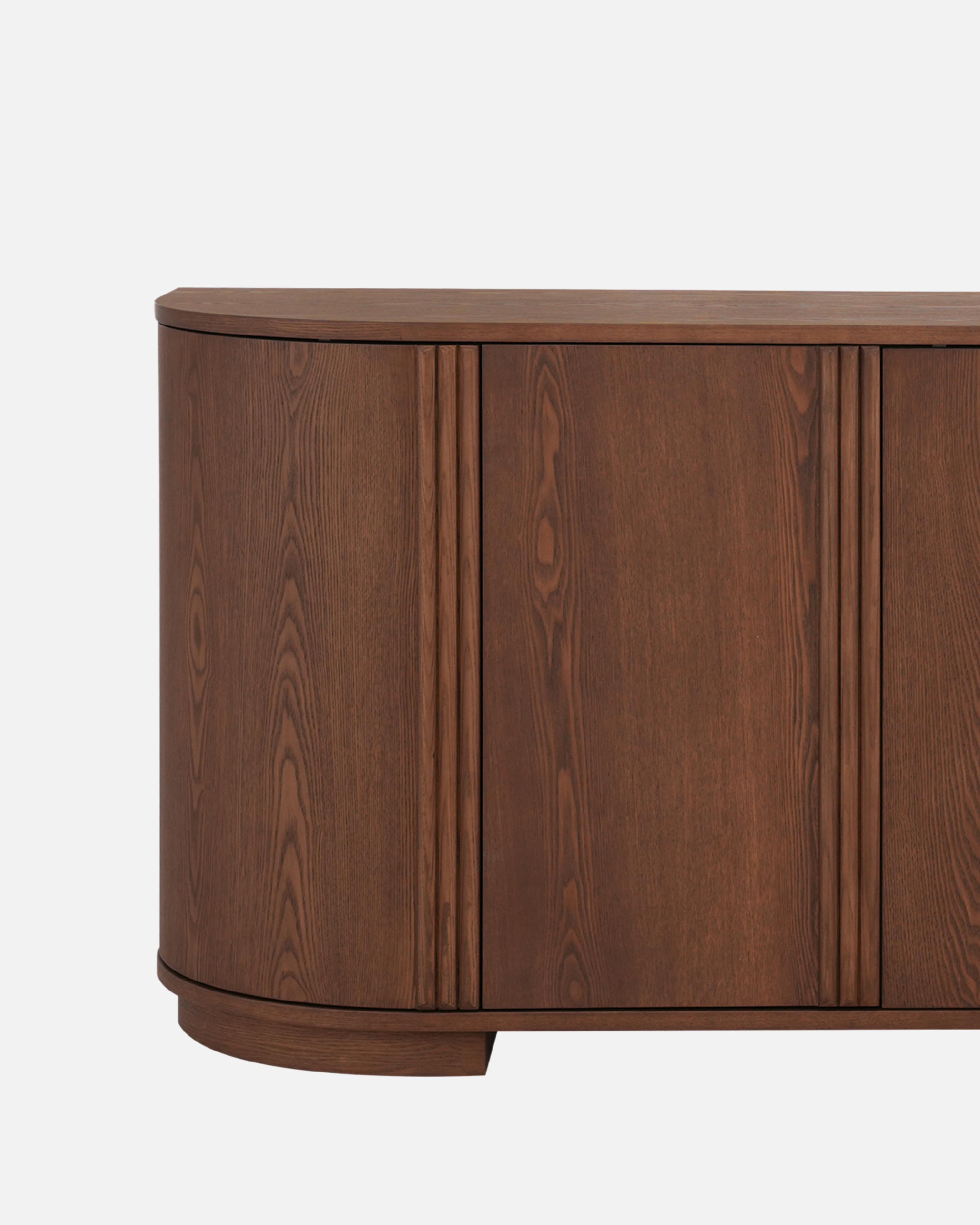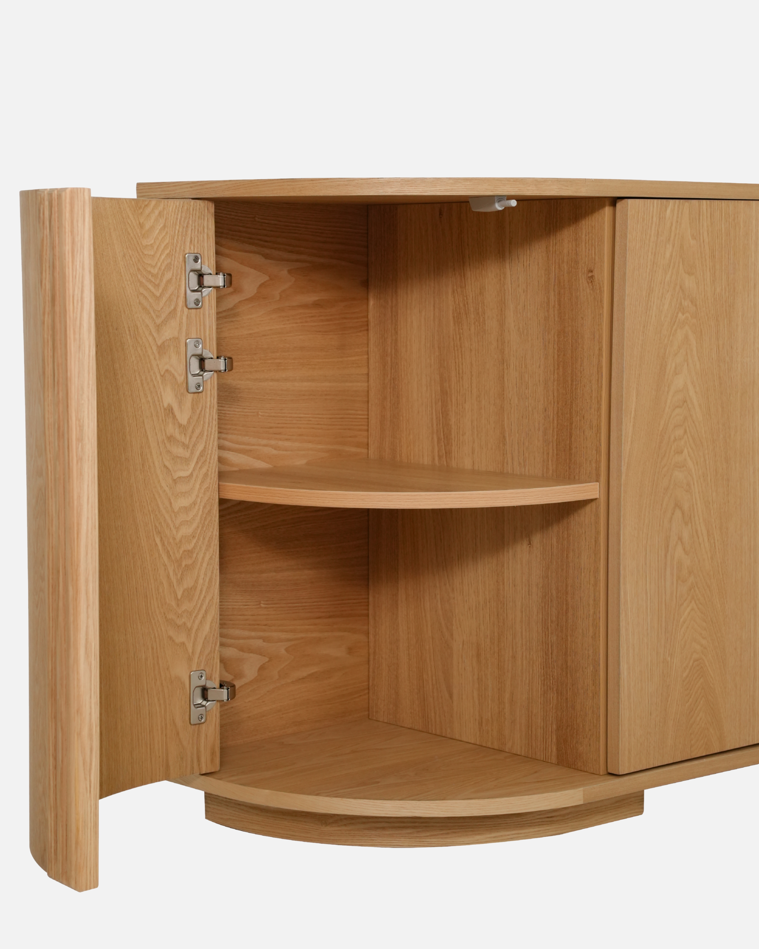 The Elm Sideboard pairs soft curves with refined detailing to create a timeless storage piece. Crafted in natural ash veneer, the design highlights the grain of the timber while keeping a warm, organic presence in the room.