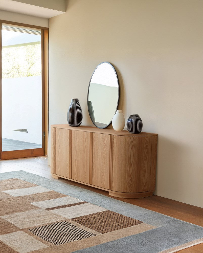 The Elm Sideboard pairs soft curves with refined detailing to create a timeless storage piece. Crafted in natural ash veneer, the design highlights the grain of the timber while keeping a warm, organic presence in the room. Concealed doors open to generous storage, allowing you to keep living spaces calm and uncluttered. A versatile piece that sits comfortably in dining, living, or entry spaces.