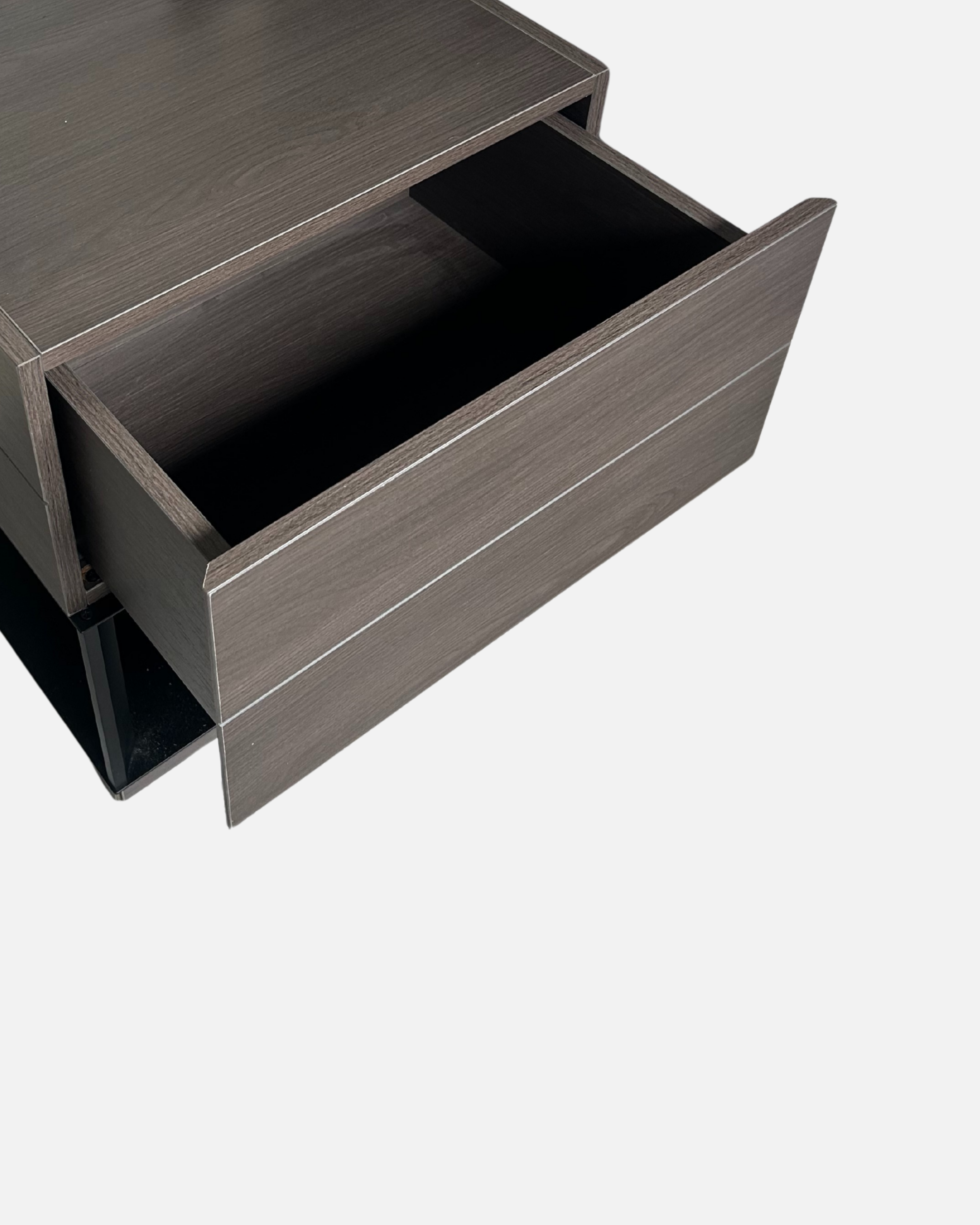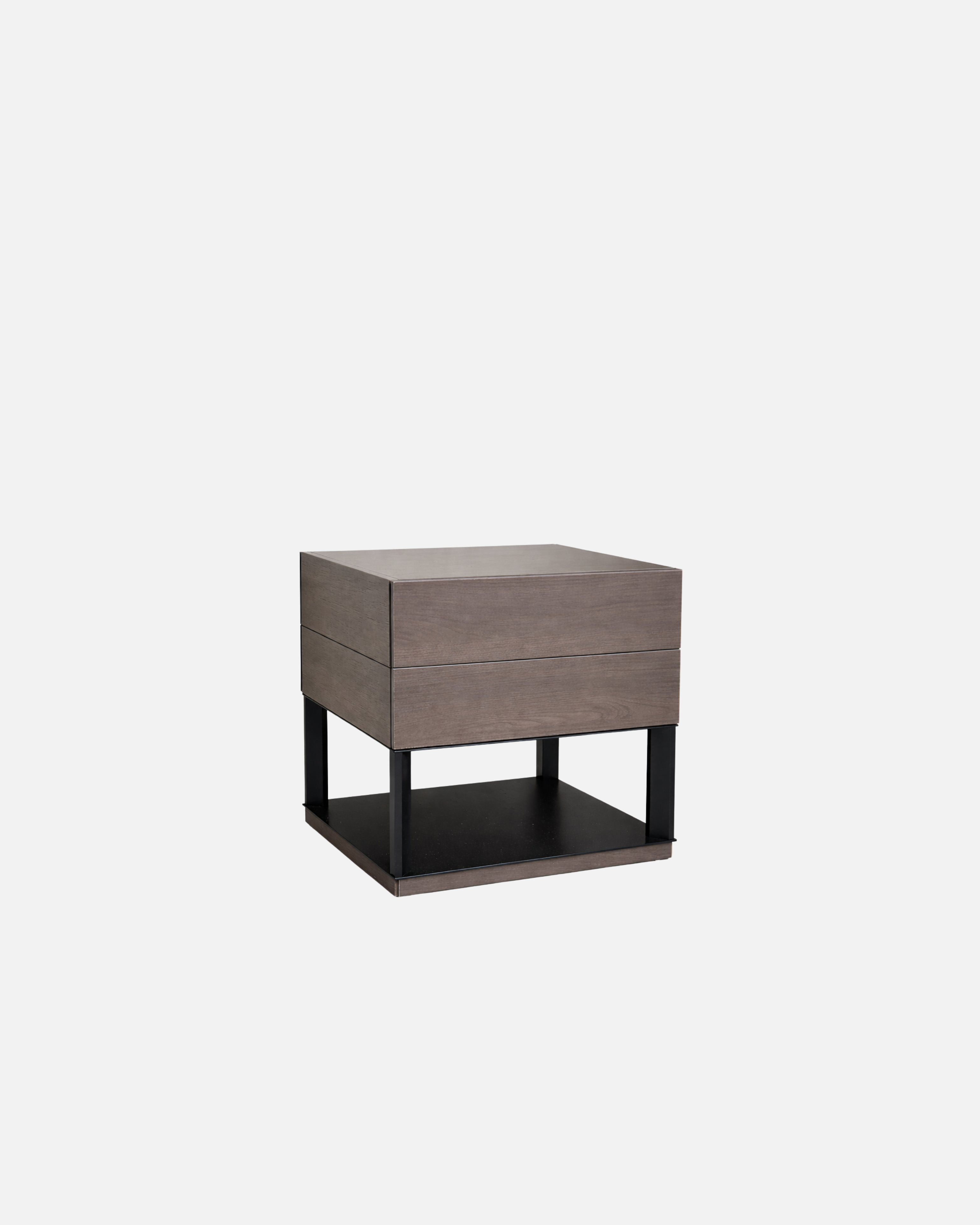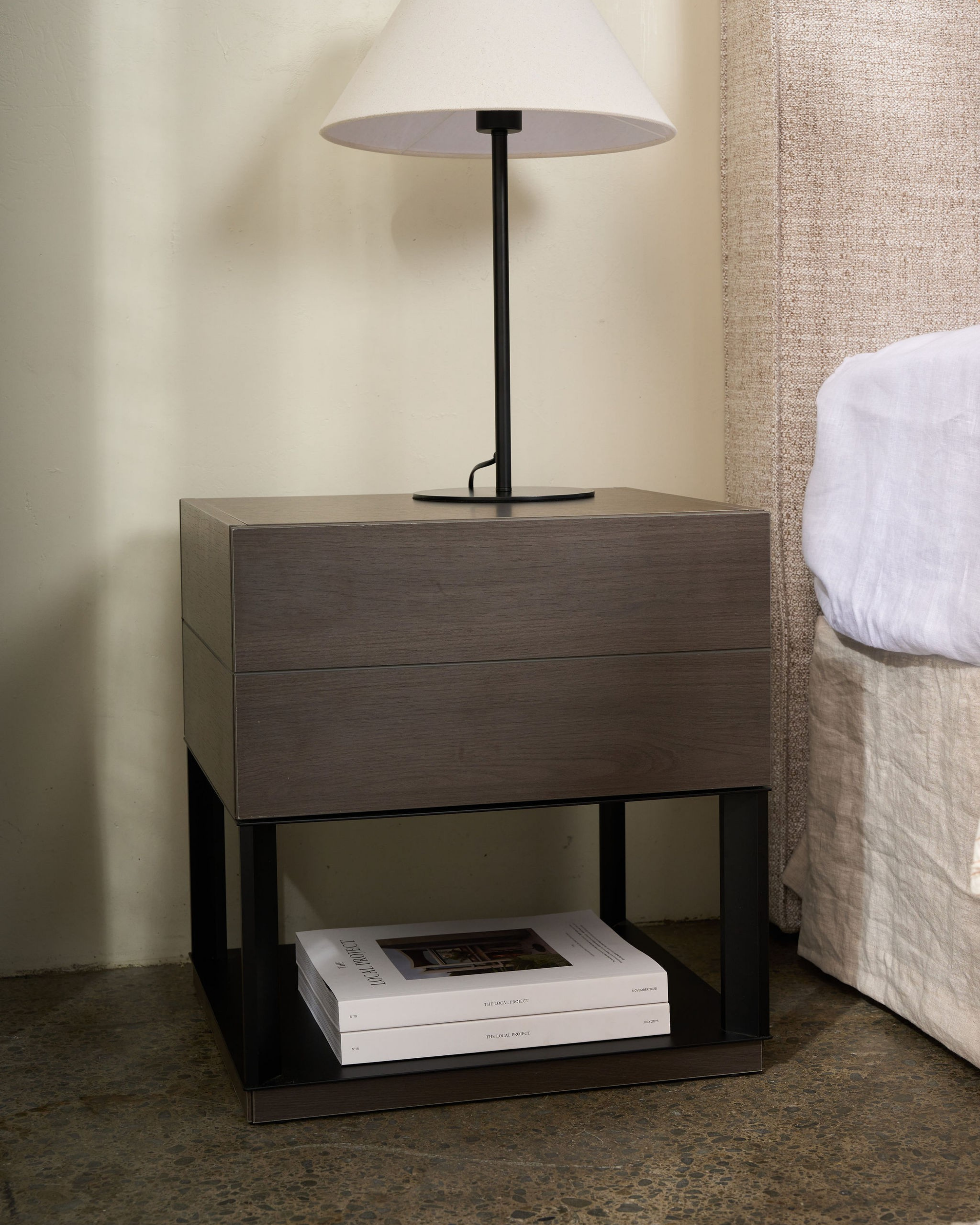 The George Bedside combines warmth and structure in a modern silhouette. A timber body is framed with a slim black base, balancing natural texture with architectural lines.
