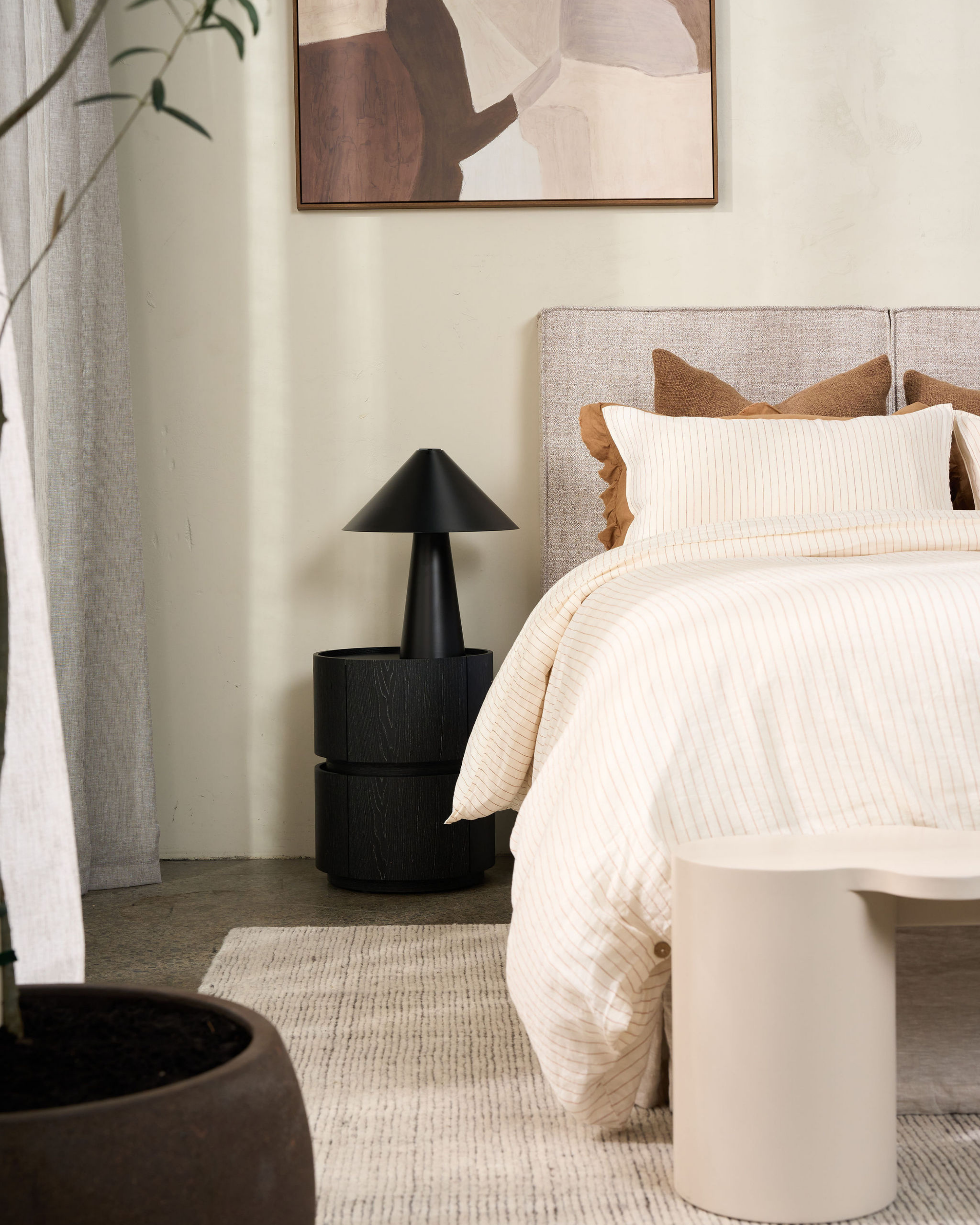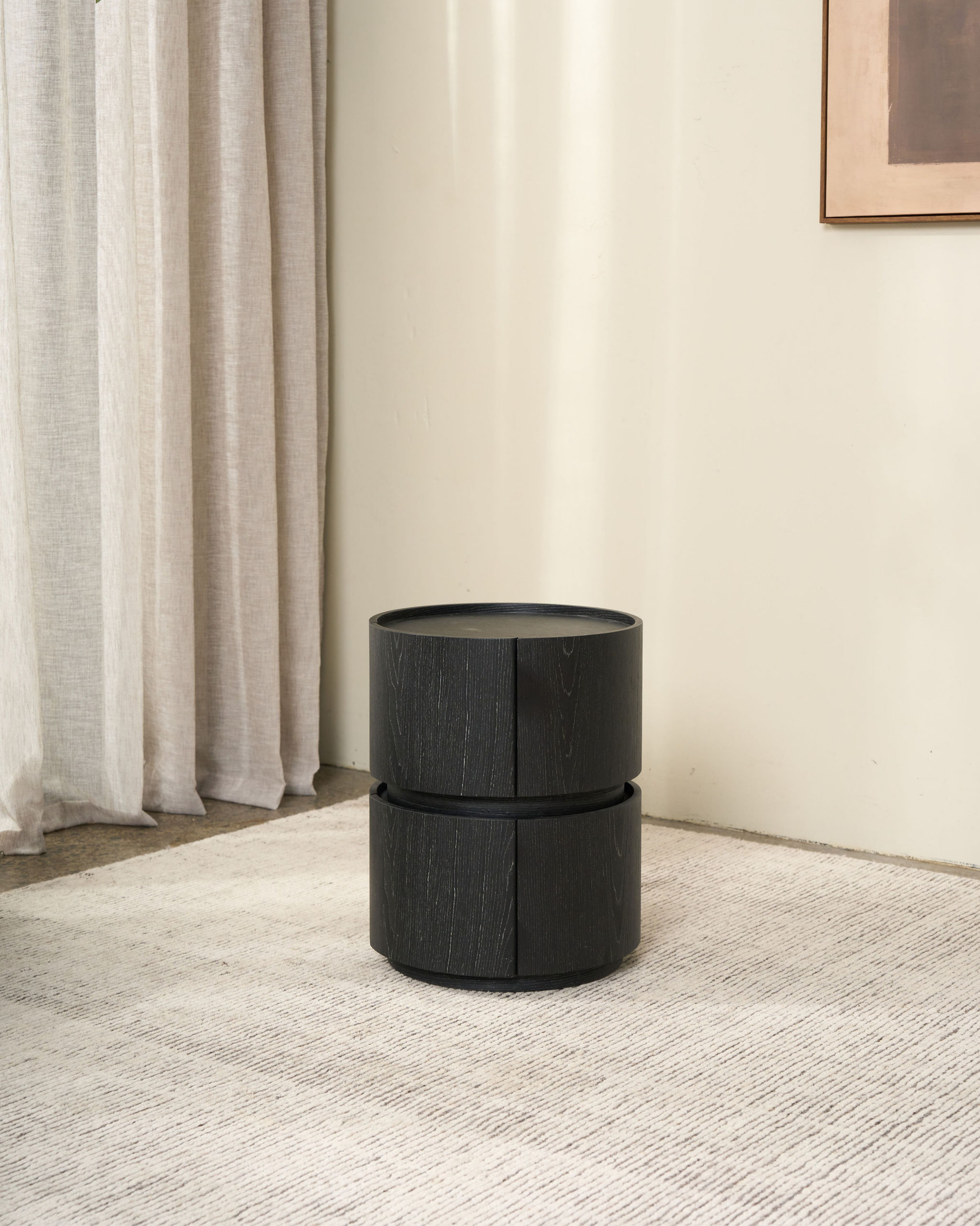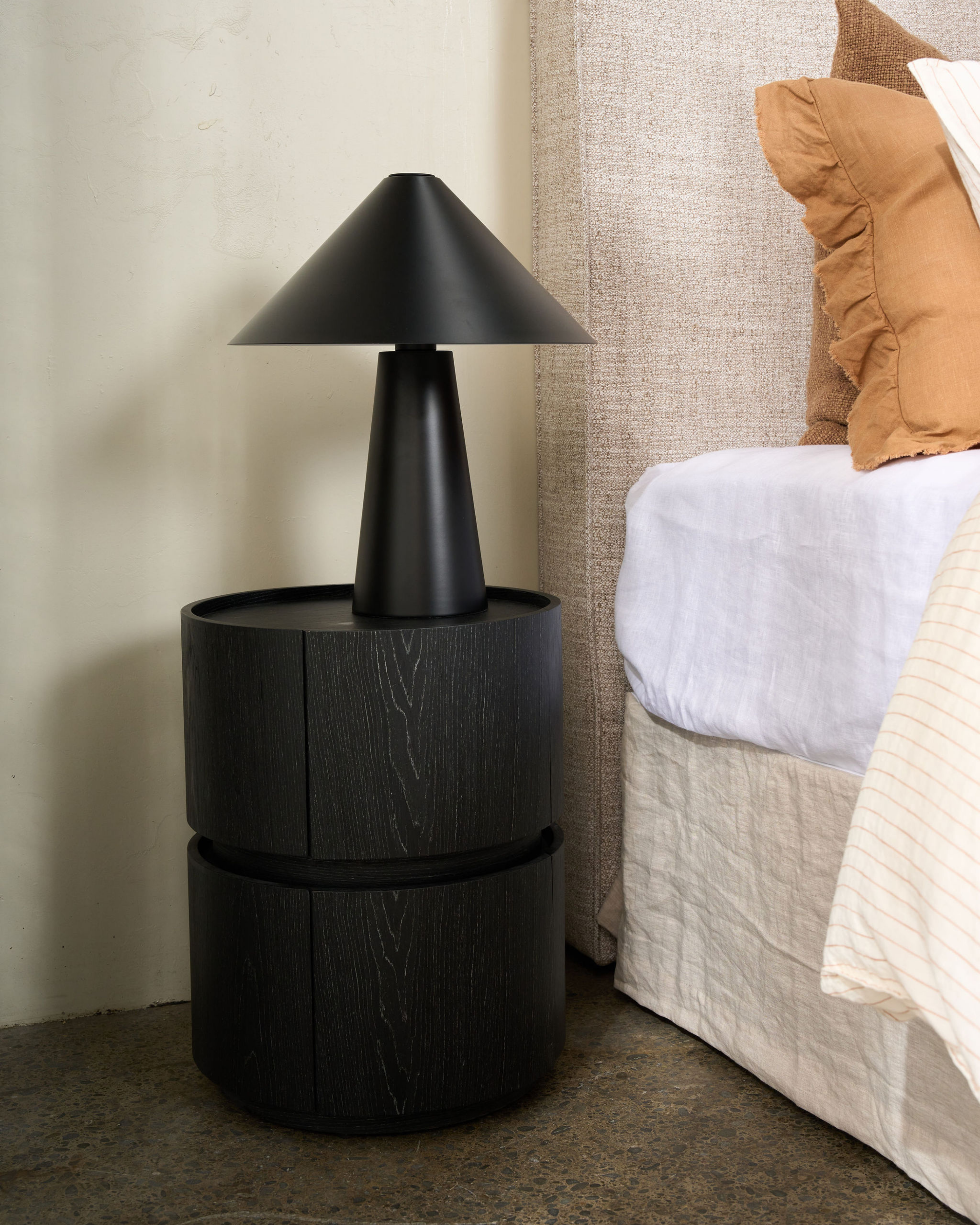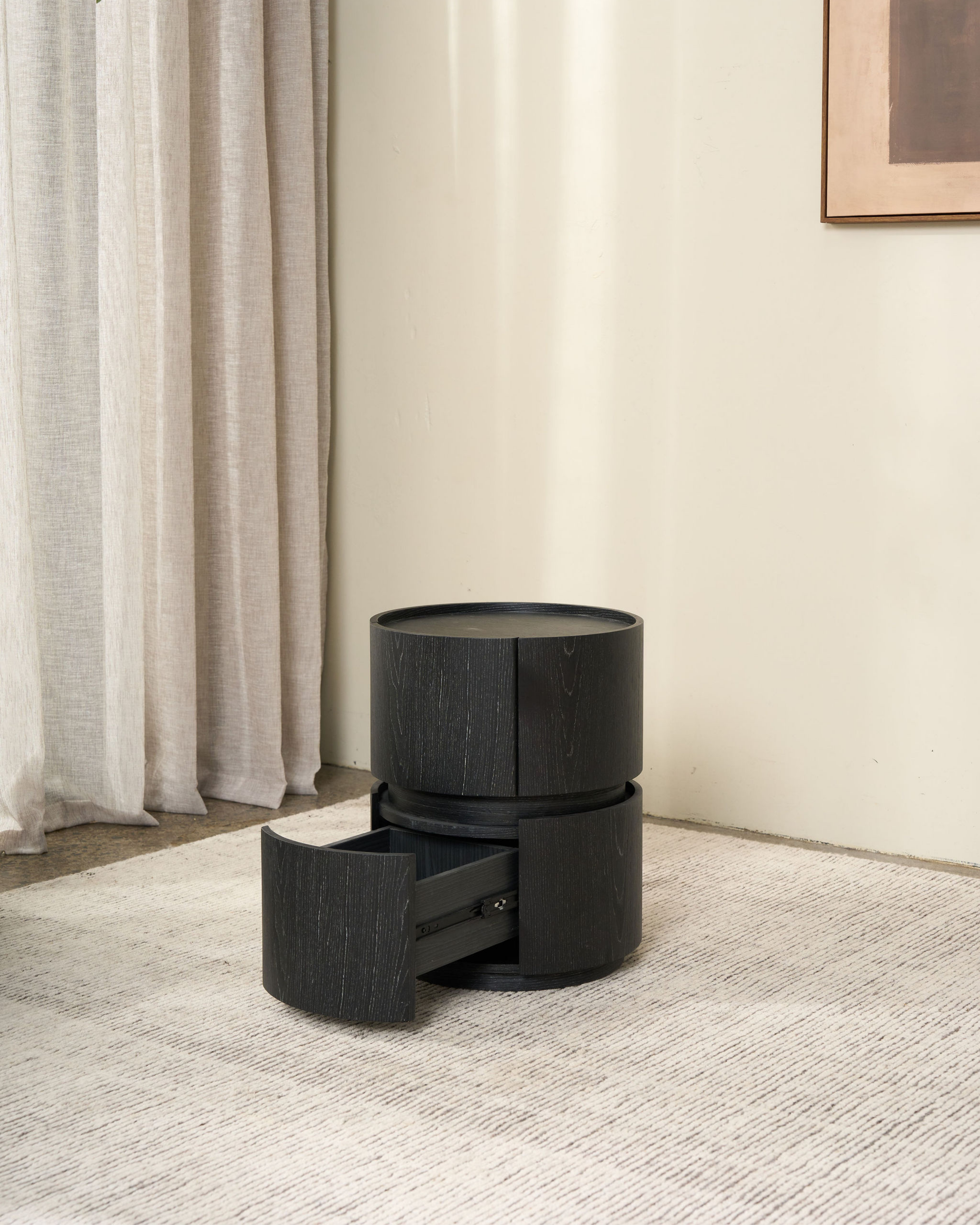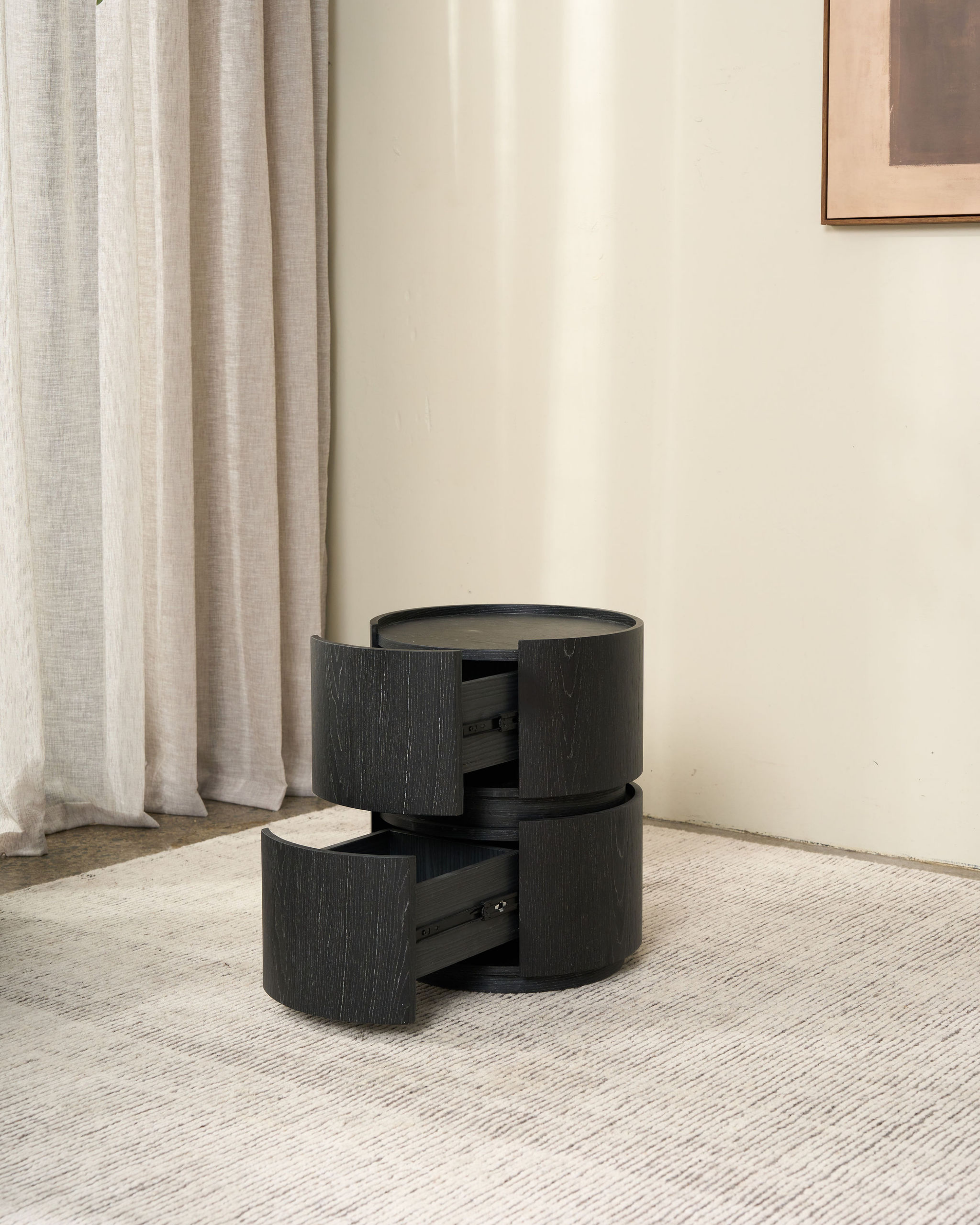 Sculptural and compact, the Kitt Bedside Table brings a bold yet considered presence to the bedroom. Its cylindrical form is softened by gently curved drawer fronts, creating a striking balance between structure and flow.