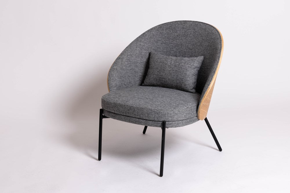 Fabric occasional chair with beech wood backing. Powder coated steel legs