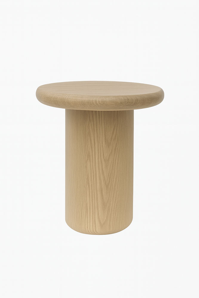 Quietly sculptural and easy to place. Rue pairs a softly rounded top with a single cylindrical base, letting the warm oak grain take centre stage. The compact footprint makes it perfect beside a sofa or chair, as a lamp perch, or even as a minimal bedside. November arrival